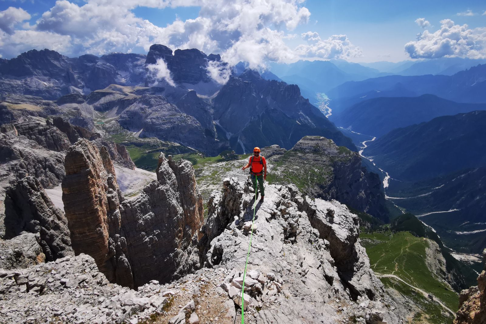 Gemeinsam begehen wir vier klassische alpine Kletterrouten der Dolomiten: die Kasnapoff-Route am Zweiten Sellaturm, die Zieglauer-Führe am Brunecker Turm, den Südgrat der Rosengartenspitze sowie die berühmte Dibona-Kante an der Großen Zinne. Jede dieser Touren bietet typische Dolomitenkletterei auf festem Fels inmitten atemberaubender Felskulissen.