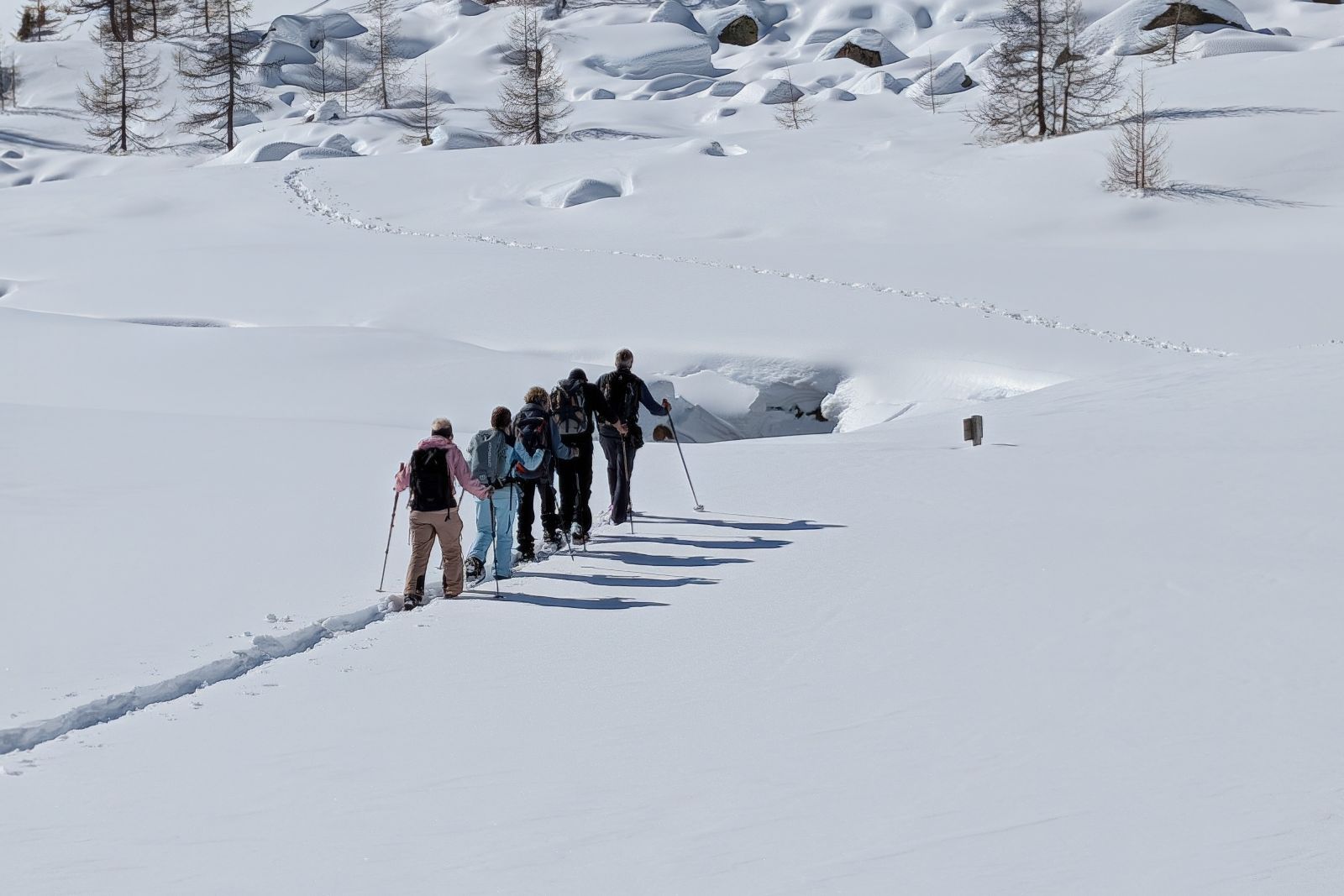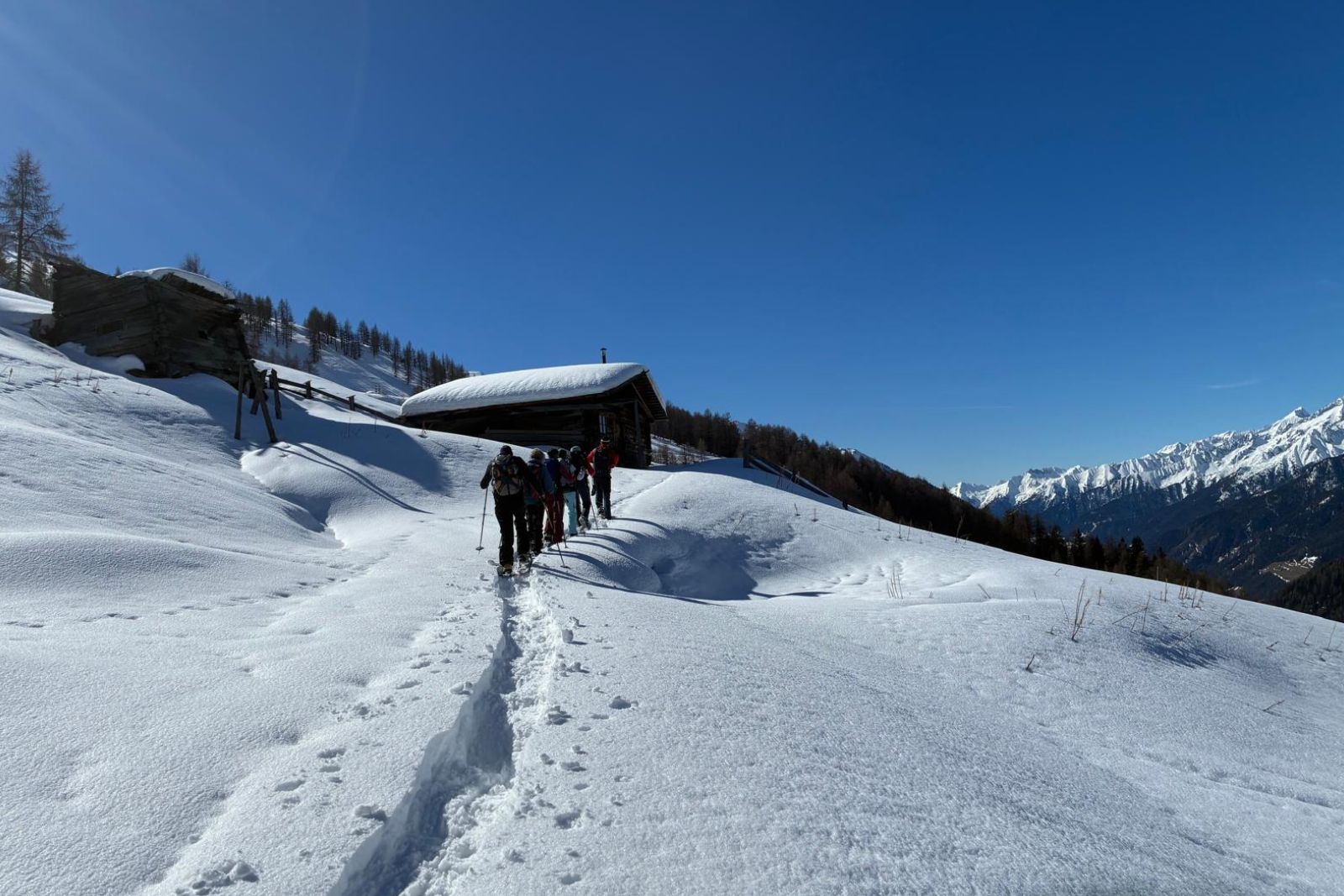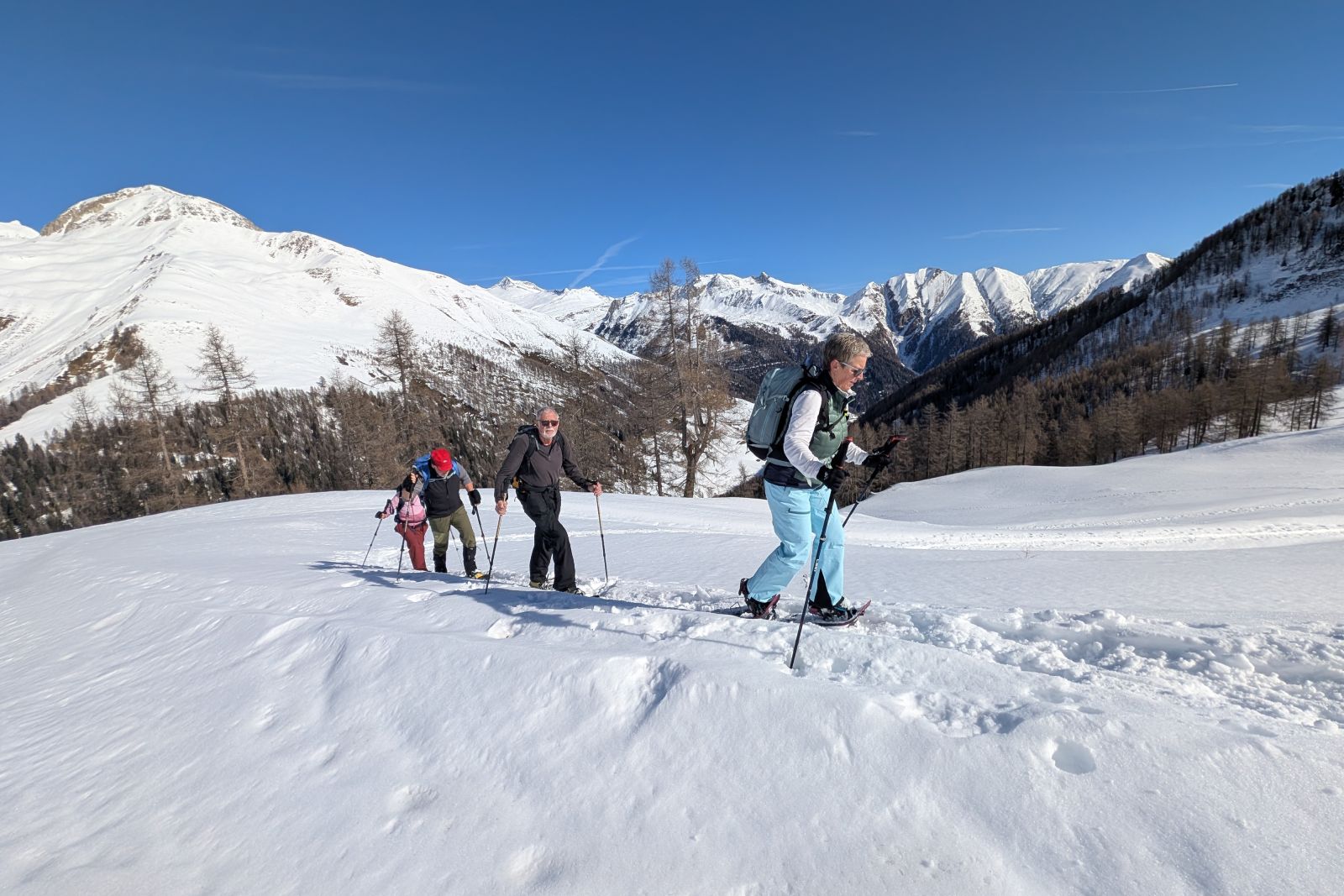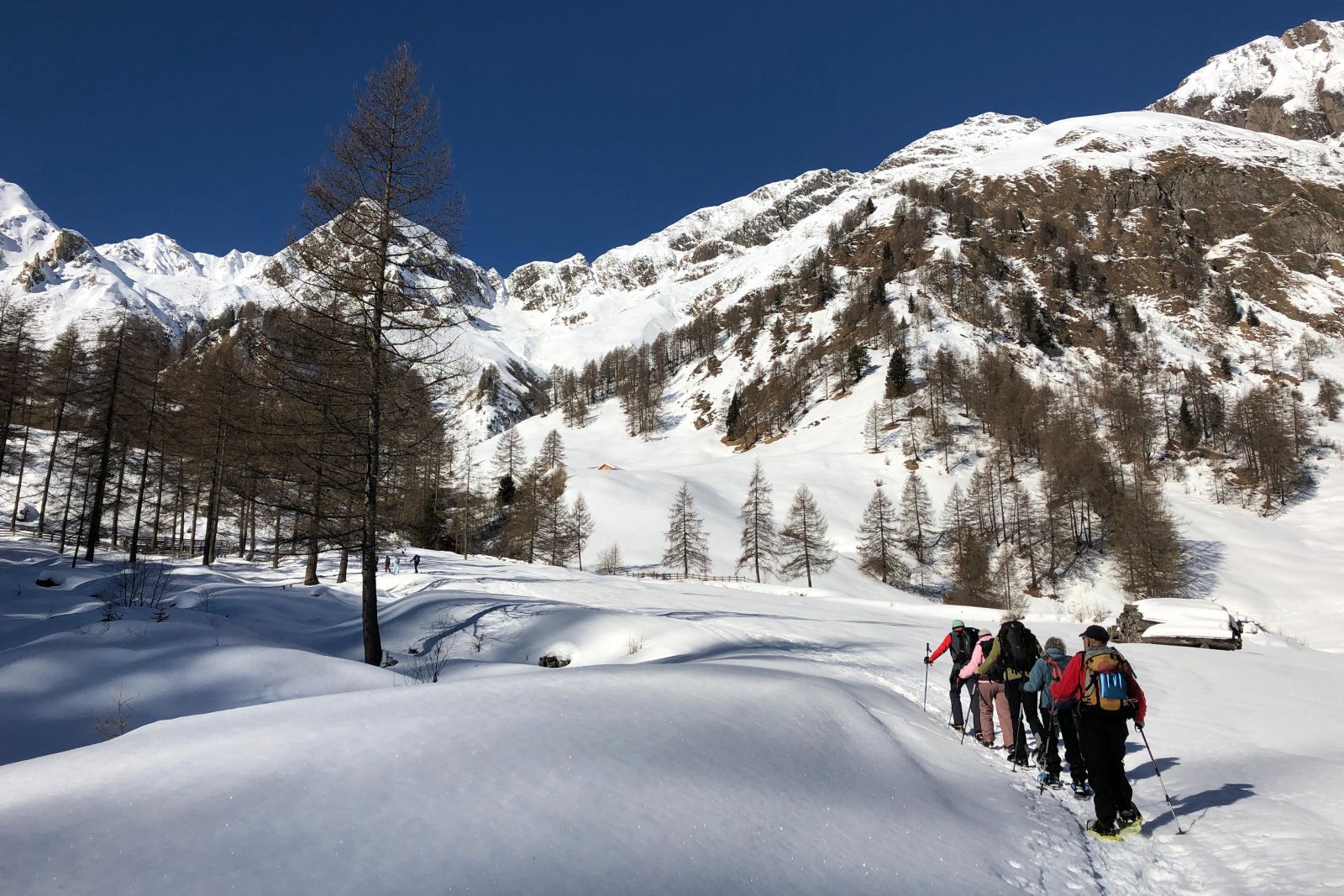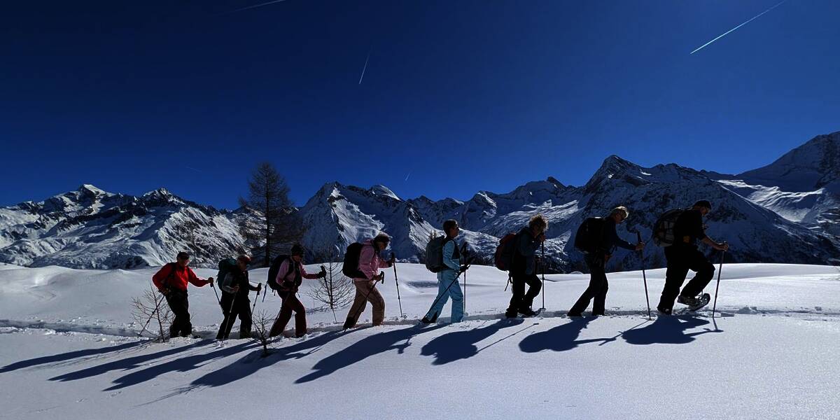 Under the expert guidance of an experienced mountain guide, the snowshoe tours lead through quiet side valleys, to traditional alpine huts, and across scenic high plateaus. With a maximum of around 600 meters of ascent per tour, the winter landscapes can be explored at a relaxed pace – ideal for pleasure hikers, beginners, and anyone looking to enjoy winter hiking in a calm and enjoyable atmosphere.
