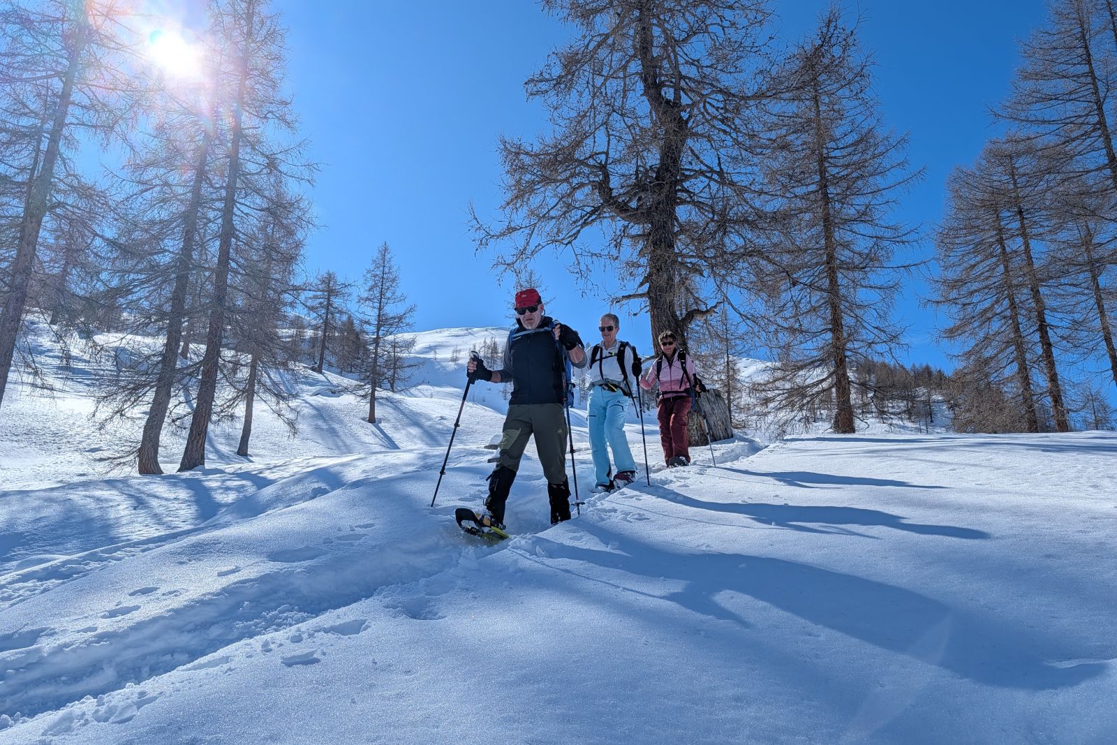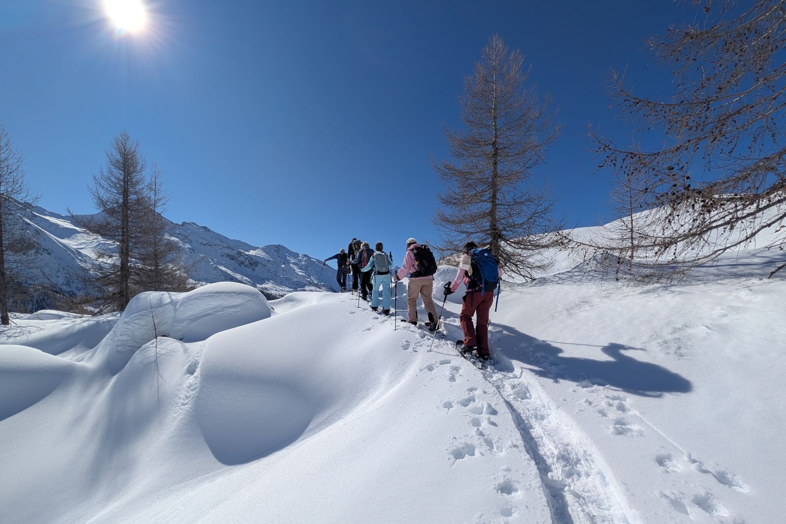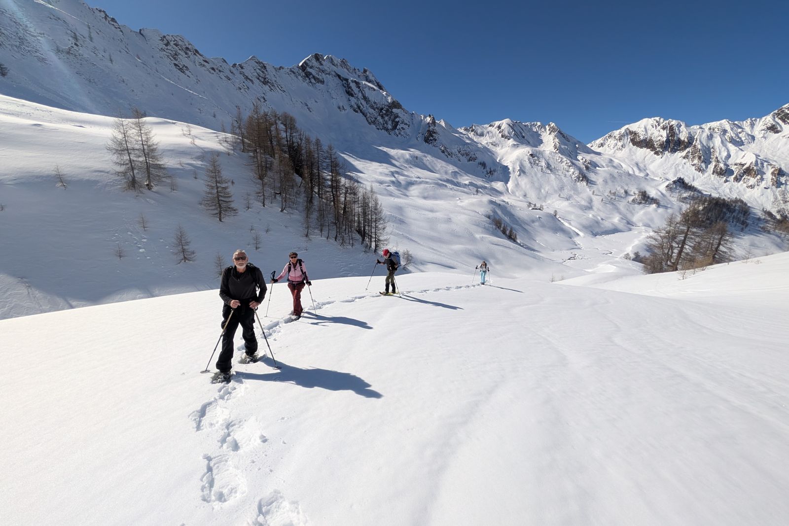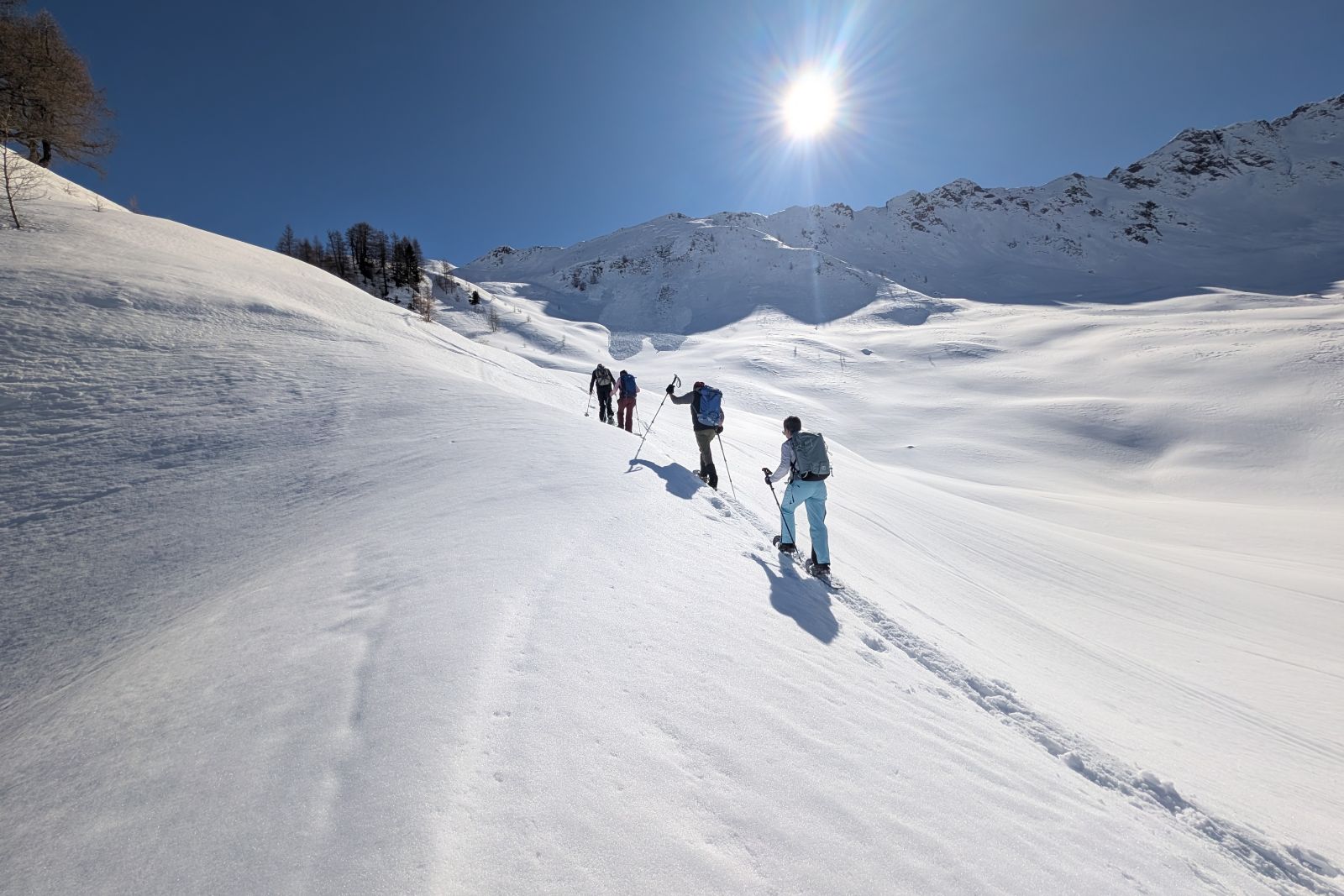 Under the expert guidance of an experienced mountain guide, the snowshoe tours lead through quiet side valleys, to traditional alpine huts, and across scenic high plateaus. With a maximum of around 600 meters of ascent per tour, the winter landscapes can be explored at a relaxed pace – ideal for pleasure hikers, beginners, and anyone looking to enjoy winter hiking in a calm and enjoyable atmosphere.