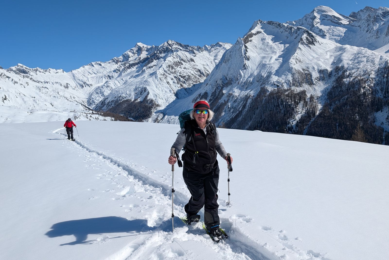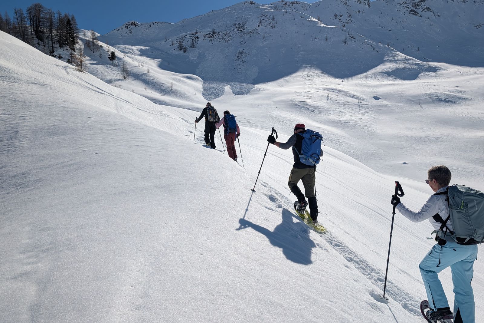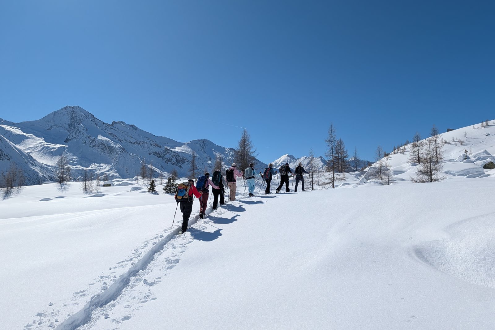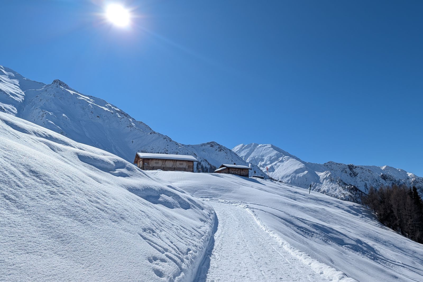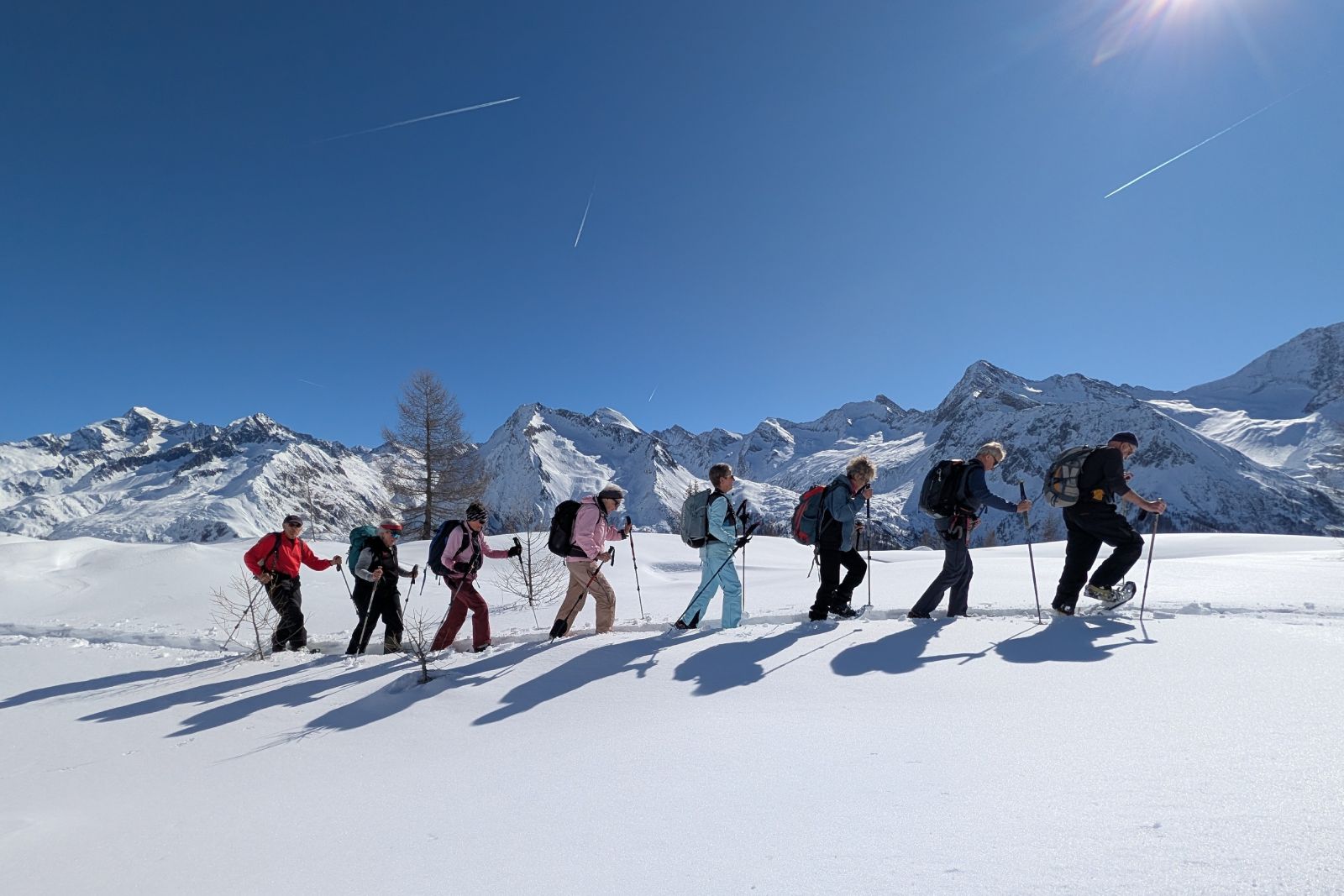 Under the expert guidance of an experienced mountain guide, the snowshoe tours lead through quiet side valleys, to traditional alpine huts, and across scenic high plateaus. With a maximum of around 600 meters of ascent per tour, the winter landscapes can be explored at a relaxed pace – ideal for pleasure hikers, beginners, and anyone looking to enjoy winter hiking in a calm and enjoyable atmosphere.