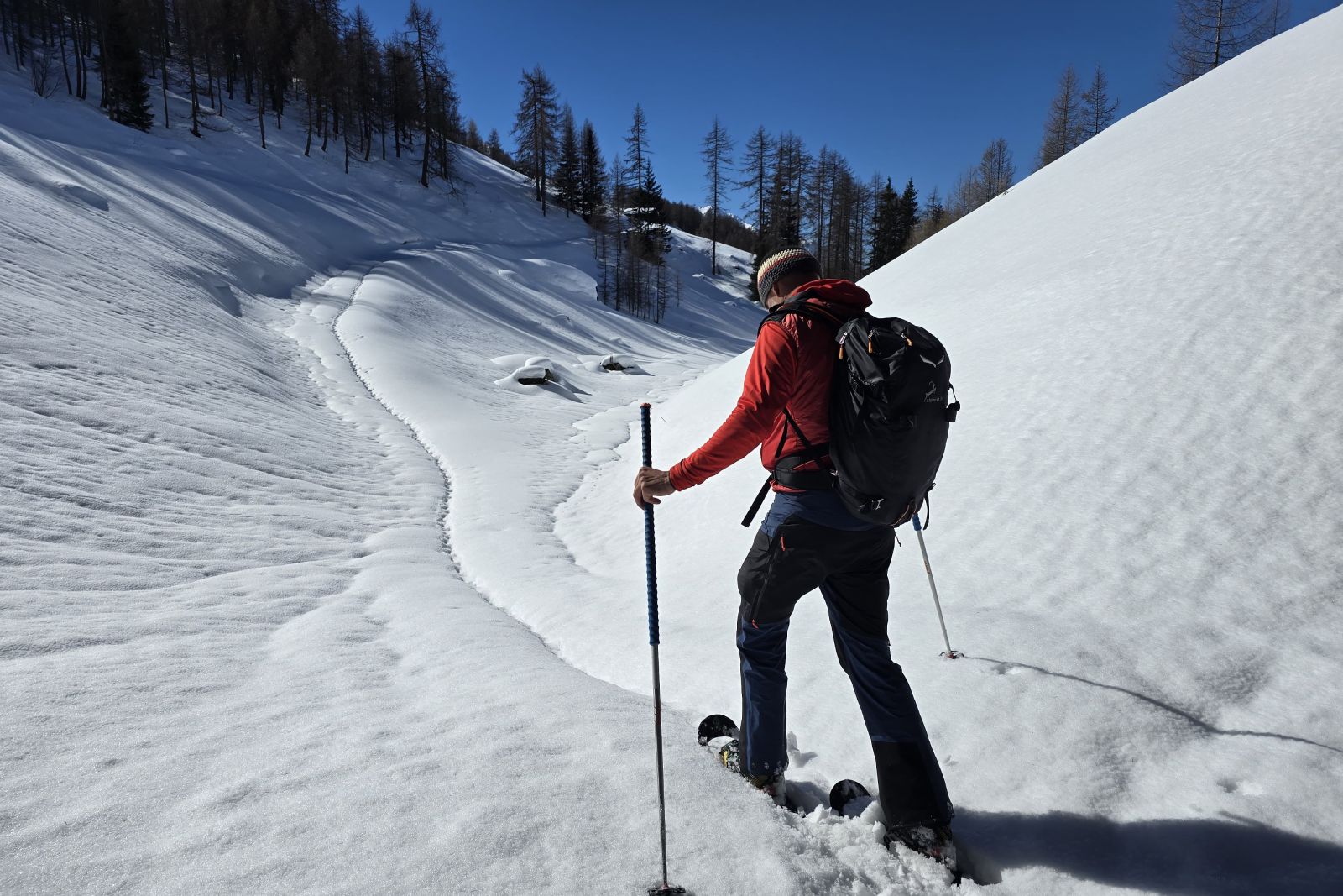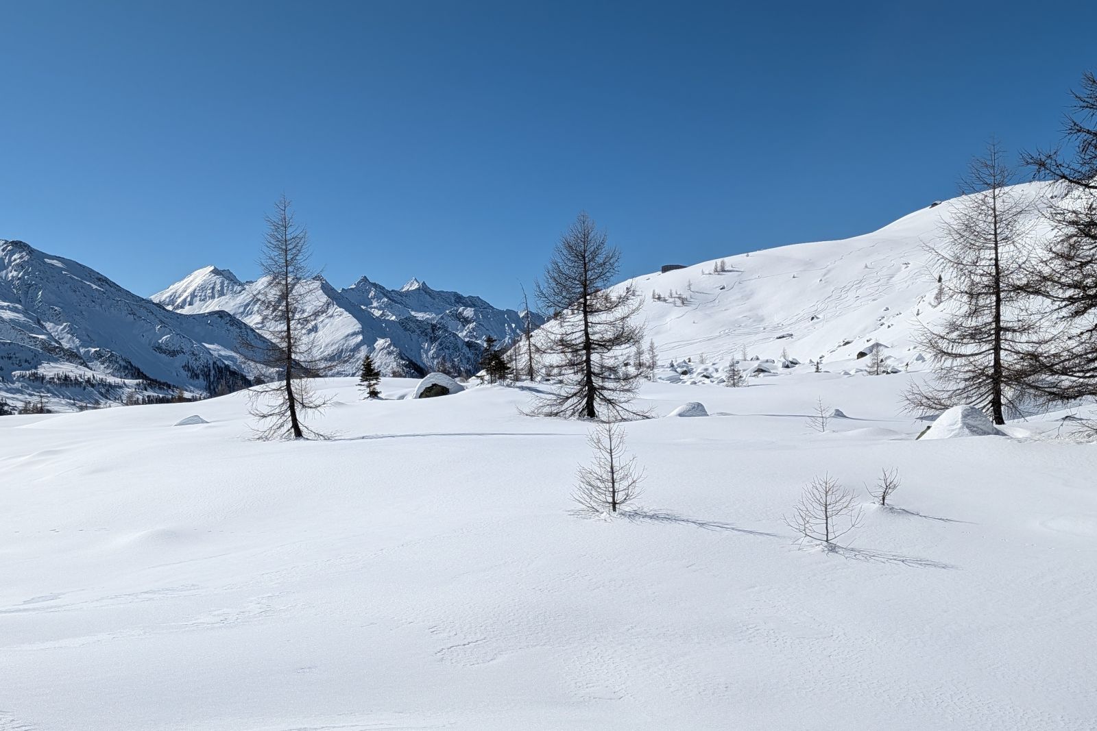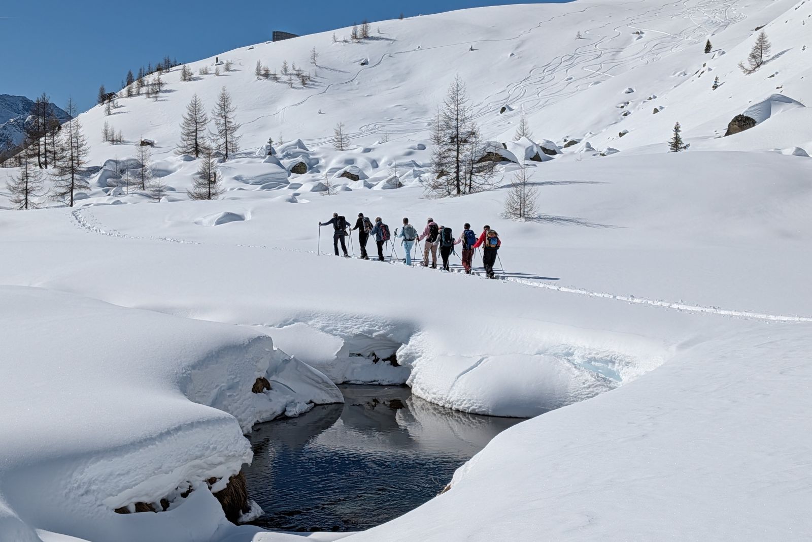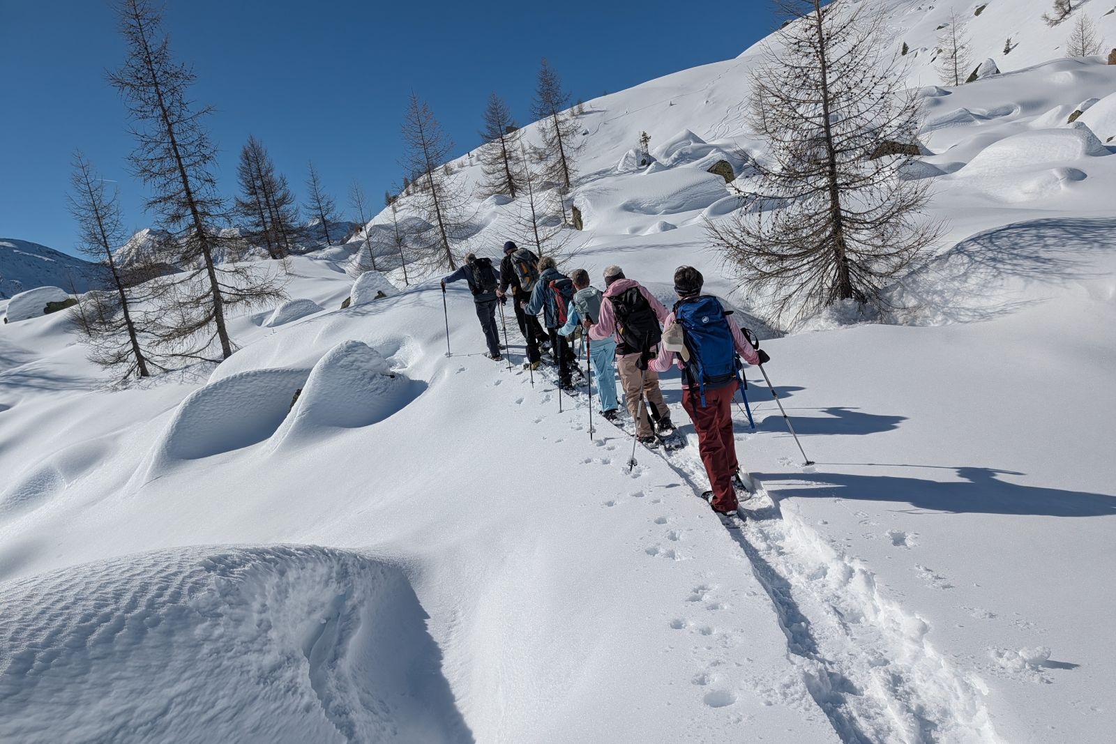 Under the expert guidance of an experienced mountain guide, the snowshoe tours lead through quiet side valleys, to traditional alpine huts, and across scenic high plateaus. With a maximum of around 600 meters of ascent per tour, the winter landscapes can be explored at a relaxed pace – ideal for pleasure hikers, beginners, and anyone looking to enjoy winter hiking in a calm and enjoyable atmosphere.