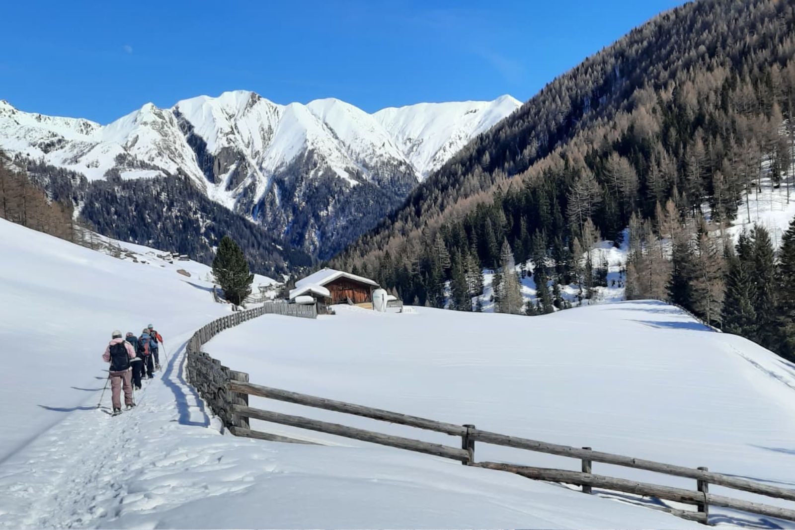 Experience a guided snowshoe hiking week in the Ahrntal Valley in South Tyrol and discover the quiet winter landscapes of one of the most unspoiled valleys in the Alps. When snowshoe hiking in the Ahrntal, you can look forward to snow-covered forests, wide alpine pastures, and impressive mountain panoramas between the 3,000-meter peaks of the Zillertal Alps and the Durreck Group.